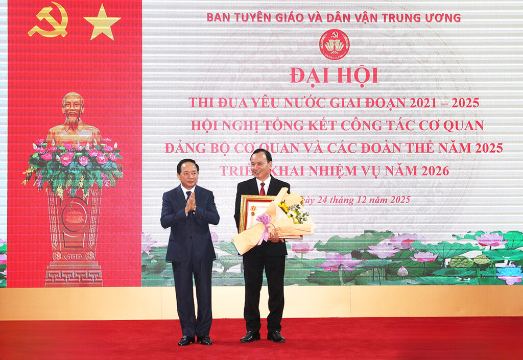 Chiều 24/12, Ban Tuyên giáo và Dân vận Trung ương tổ chức Đại hội Thi đua yêu nước giai đoạn 2021-2025; Hội nghị tổng kết công tác cơ quan, Đảng bộ cơ quan và các đoàn thể năm 2025, triển khai nhiệm vụ năm 2026. Đồng chí Trịnh Văn Quyết, Bí thư Trung ương Đảng, Trưởng Ban Tuyên giáo và Dân vận Trung ương dự và phát biểu chỉ đạo.