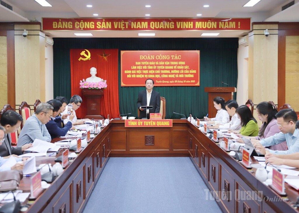 Ngày 29/10, Đoàn công tác của Ban Tuyên giáo và Dân vận Trung ương làm việc với Tỉnh ủy Tuyên Quang về triển khai Nghị quyết số 57-NQ/TW ngày 22/12/2024 của Bộ Chính trị về đột phá phát triển khoa học và công nghệ, đổi mới sáng tạo và chuyển đổi số quốc gia; Kết luận số 81-KL/TW ngày 4/6/2024 của Bộ Chính trị về tiếp tục thực hiện Nghị quyết Trung ương 7 khóa XI về chủ động ứng phó với biến đổi khí hậu, tăng cường quản lý tài nguyên và bảo vệ môi trường.