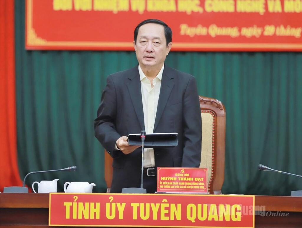Phát biểu kết luận buổi làm việc, đồng chí Huỳnh Thành Đạt, Ủy viên Trung ương Đảng, Phó Trưởng ban Tuyên giáo và Dân vận Trung ương biểu dương những nỗ lực của tỉnh Tuyên Quang trong triển khai các nghị quyết, kết luận của Bộ Chính trị. Những kết quả triển khai của tỉnh cho thấy sự nỗ lực to lớn, tinh thần dấn thân, trách nhiệm và đổi mới sáng tạo của Đảng bộ, chính quyền và nhân dân các dân tộc tỉnh Tuyên Quang.