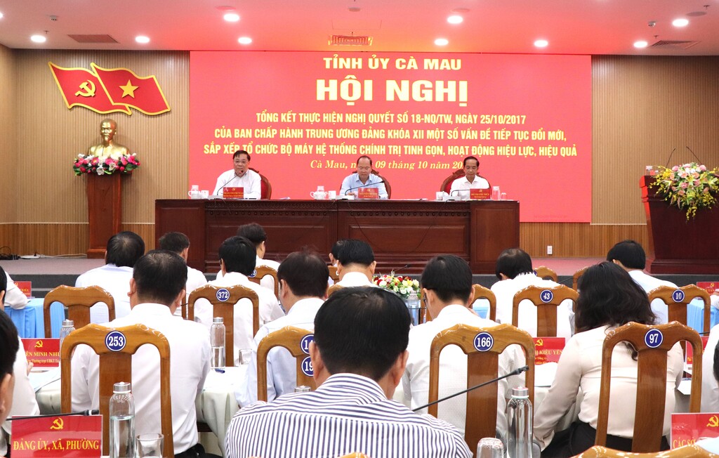 Ngày 9/10, Tỉnh ủy Cà Mau tổ chức Hội nghị tổng kết thực hiện Nghị quyết số 18-NQ/TW, ngày 25/10/2017 của Ban Chấp hành Trung ương Đảng khóa XII về "Một số vấn đề về tiếp tục đổi mới, sắp xếp tổ chức bộ máy của hệ thống chính trị tinh gọn, hoạt động hiệu lực, hiệu quả".
