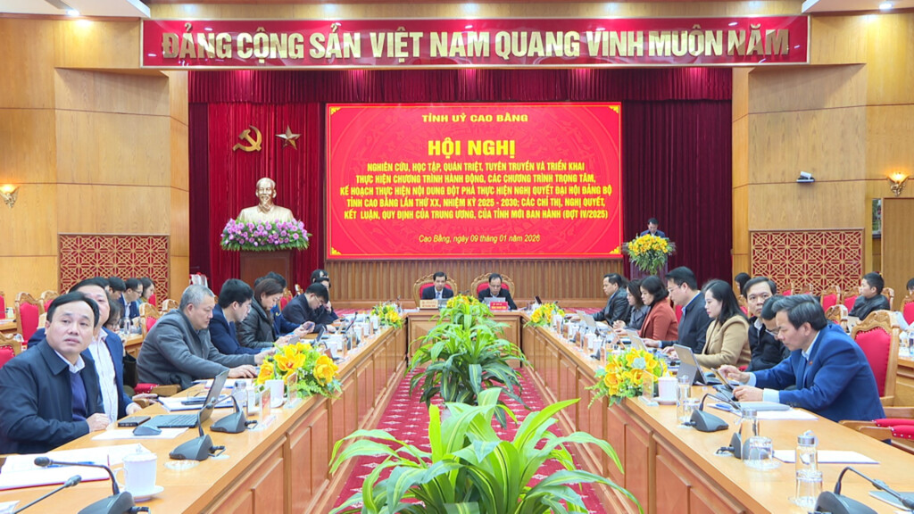 Sáng 09/01, Tỉnh ủy Cao Bằng tổ chức Hội nghị nghiên cứu, học tập, quán triệt, tuyên truyền và triển khai chương trình hành động, các chương trình trọng tâm, kế hoạch thực hiện nội dung đột phá thực hiện Nghị quyết Đại hội Đảng bộ tỉnh lần thứ XX, nhiệm kỳ 2025 - 2030; các chỉ thị, nghị quyết, kết luận, quy định của Trung ương, của tỉnh mới ban hành. Hội nghị được kết nối trực tuyến đến 144 điểm cầu với trên 5.700 đại biểu tham gia.