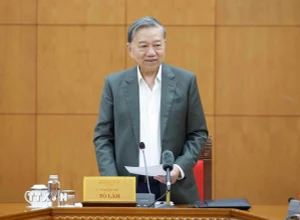 Đại tướng Lương Tam Quang, Ủy viên Bộ Chính trị, Bí thư Đảng ủy Công an Trung ương, Bộ trưởng Bộ Công an dự, chỉ đạo và động viên đoàn viên, hội viên tại Chương trình. -