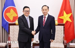 Thứ trưởng Bộ Ngoại giao Việt Nam Nguyễn Mạnh Cường chào xã giao Thường trực Ban Bí thư Trung ương Đảng Nhân dân Cách mạng Lào, trao đổi các biện pháp tăng cường gắn kết chiến lược giữa hai nước. -