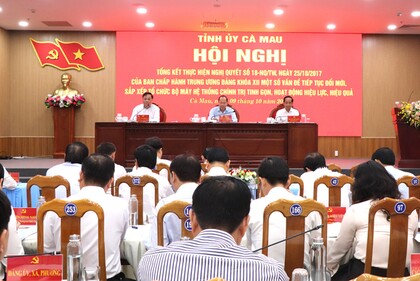 Ngày 9/10, Tỉnh ủy Cà Mau tổ chức Hội nghị tổng kết thực hiện Nghị quyết số 18-NQ/TW, ngày 25/10/2017 của Ban Chấp hành Trung ương Đảng khóa XII về "Một số vấn đề về tiếp tục đổi mới, sắp xếp tổ chức bộ máy của hệ thống chính trị tinh gọn, hoạt động hiệu lực, hiệu quả". -