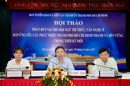 Sáng 29/8, Ban Tuyên giáo và Dân vận Thành ủy Thành phó Hồ Chí Minh tổ chức Hội thảo “Phát huy vai trò đội ngũ trí thức, văn nghệ sĩ đáp ứng yêu cầu phát triển Thành phố Hồ Chí Minh nhanh và bền vững trong thời kỳ mới”. Hội thảo quy tụ gần 300 đại biểu là các chuyên gia, nhà khoa học, trí thức, văn nghệ sĩ cùng đại diện các sở, ban, ngành của Thành phố. -