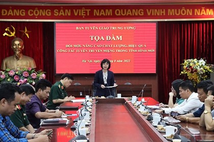 Nằm trong chuỗi hoạt động chuẩn bị cho tổng kết 15 năm thực hiện Chỉ thị số 17-CT/TW ngày 15/10/2007 của Ban Bí thư về “Tiếp tục đổi mới và nâng cao chất lượng, hiệu quả công tác tuyên truyền miệng trong tình hình mới”, chiều 10/8, Ban Tuyên giáo Trung ương tổ chức Tọa đàm với chủ đề “Đổi mới, nâng cao chất lượng, hiệu quả công tác tuyên truyền miệng trong tình hình mới”, khu vực phía Bắc. -