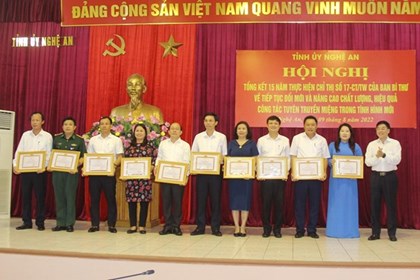 Tỉnh uỷ Nghệ An vừa tổ chức Hội nghị tổng kết 15 năm thực hiện Chỉ thị số 17-CT/TW của Ban Bí thư (khóa X) về “Tiếp tục đổi mới và nâng cao chất lượng, hiệu quả công tác tuyên truyền miệng trong tình hình mới”. -