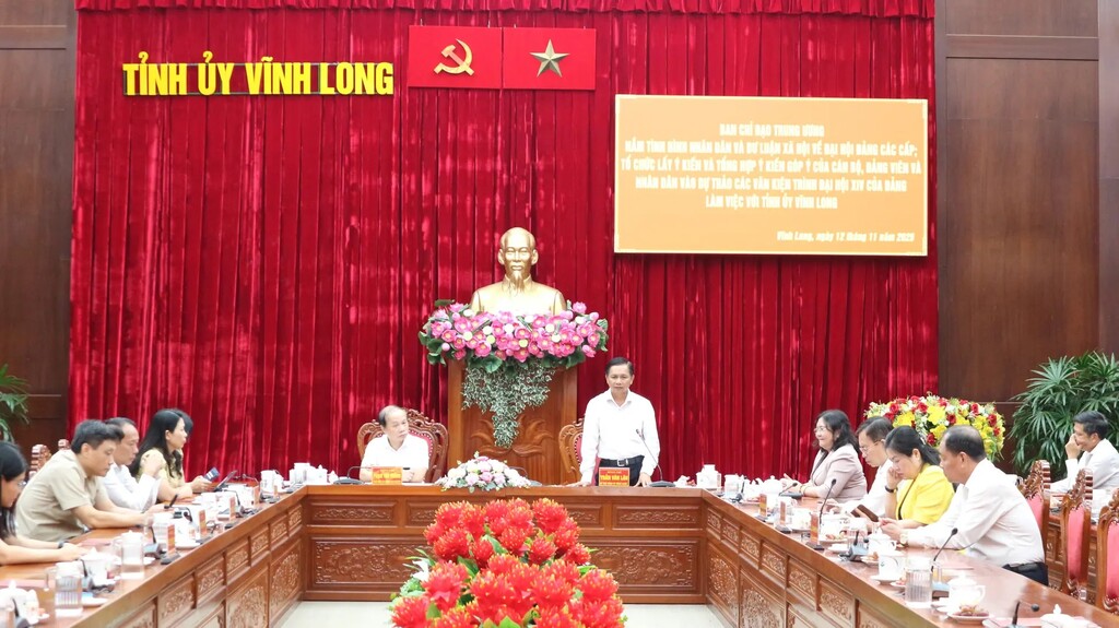 Ngày 12/11, Đoàn công tác Ban Chỉ đạo Trung ương nắm tình hình nhân dân và dư luận xã hội về đại hội đảng bộ các cấp, tổ chức lấy ý kiến và tổng hợp ý kiến nhân dân góp ý vào dự thảo các văn kiện trình Đại hội lần thứ XIV của Đảng, đã có buổi làm việc với Tỉnh ủy Vĩnh Long. Các đồng chí: Phạm Tất Thắng, Ủy viên Trung ương Đảng, Phó Trưởng ban Tuyên giáo và Dân vận Trung ương; Trần Văn Lâu, Bí thư Tỉnh ủy Vĩnh Long chủ trì buổi làm việc.