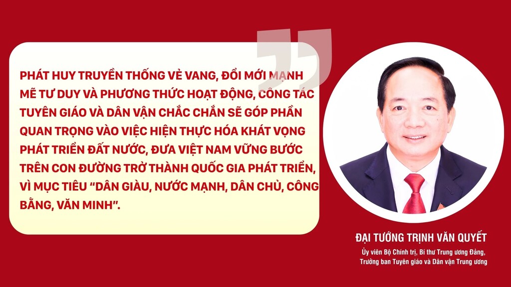 Mục tiêu tăng trưởng hai con số và xây dựng một xã hội phồn vinh, văn minh, hạnh phúc là một khát vọng lớn, đòi hỏi sự nỗ lực của toàn Đảng, toàn dân, toàn quân. Trong hành trình đó, công tác tuyên giáo và dân vận không chỉ là “cầu nối” mà phải thực sự trở thành người dẫn đường về tư tưởng; người khơi nguồn cảm hứng phát triển; người kết nối và huy động sức mạnh toàn xã hội. Phát huy truyền thống vẻ vang, đổi mới mạnh mẽ tư duy và phương thức hoạt động, công tác tuyên giáo và dân vận chắc chắn sẽ góp phần quan trọng vào việc hiện thực hóa khát vọng phát triển đất nước, đưa Việt Nam vững bước trên con đường trở thành quốc gia phát triển, vì mục tiêu “dân giàu, nước mạnh, dân chủ, công bằng, văn minh”.
