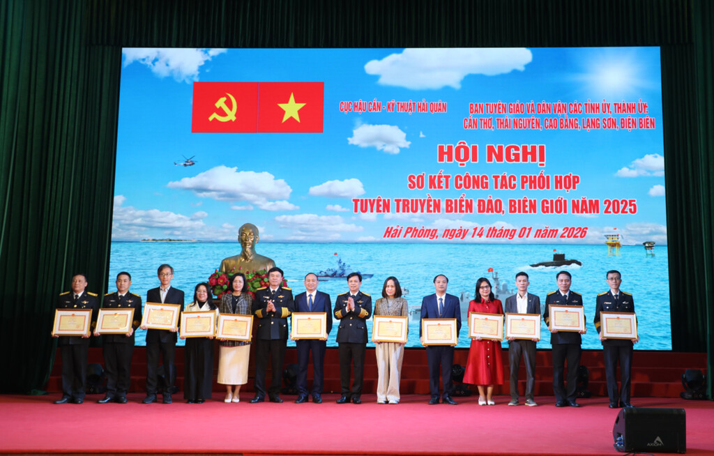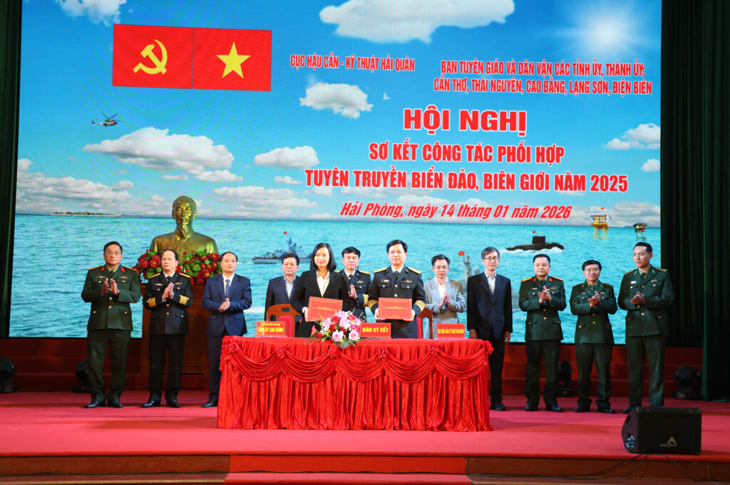 Ngày 14/01, tại Hải Phòng, Cục Hậu cần - Kỹ thuật, Quân chủng Hải quân phối hợp với Ban Tuyên giáo và Dân vận 5 Tỉnh ủy, Thành ủy: Thái Nguyên, Cao Bằng, Lạng Sơn, Điện Biên, Cần Thơ, tổ chức Hội nghị sơ kết công tác phối hợp tuyên truyền biển, đảo, biên giới năm 2025.