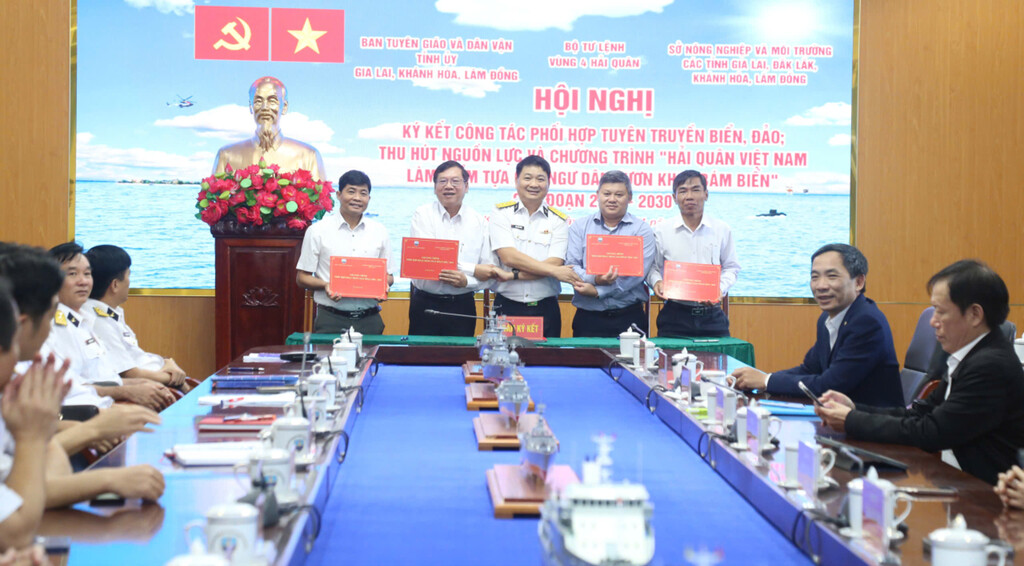 Dịp này, Bộ Tư lệnh Vùng 4 Hải quân cùng Sở Nông nghiệp và Môi trường các tỉnh Gia Lai, Đắk Lắk, Khánh Hòa và Lâm Đồng đã ký kết phối hợp thực hiện Chương trình “Hải quân Việt Nam làm điểm tựa cho ngư dân vươn khơi, bám biển”. Chương trình nhằm tăng cường phối hợp tuyên truyền, hỗ trợ ngư dân phát triển kinh tế biển bền vững; nâng cao nhận thức pháp luật về khai thác, bảo vệ nguồn lợi thủy sản và phòng chống khai thác IUU; huy động nguồn lực xã hội chăm lo đời sống vật chất, tinh thần cho ngư dân và con em ngư dân có hoàn cảnh khó khăn./.