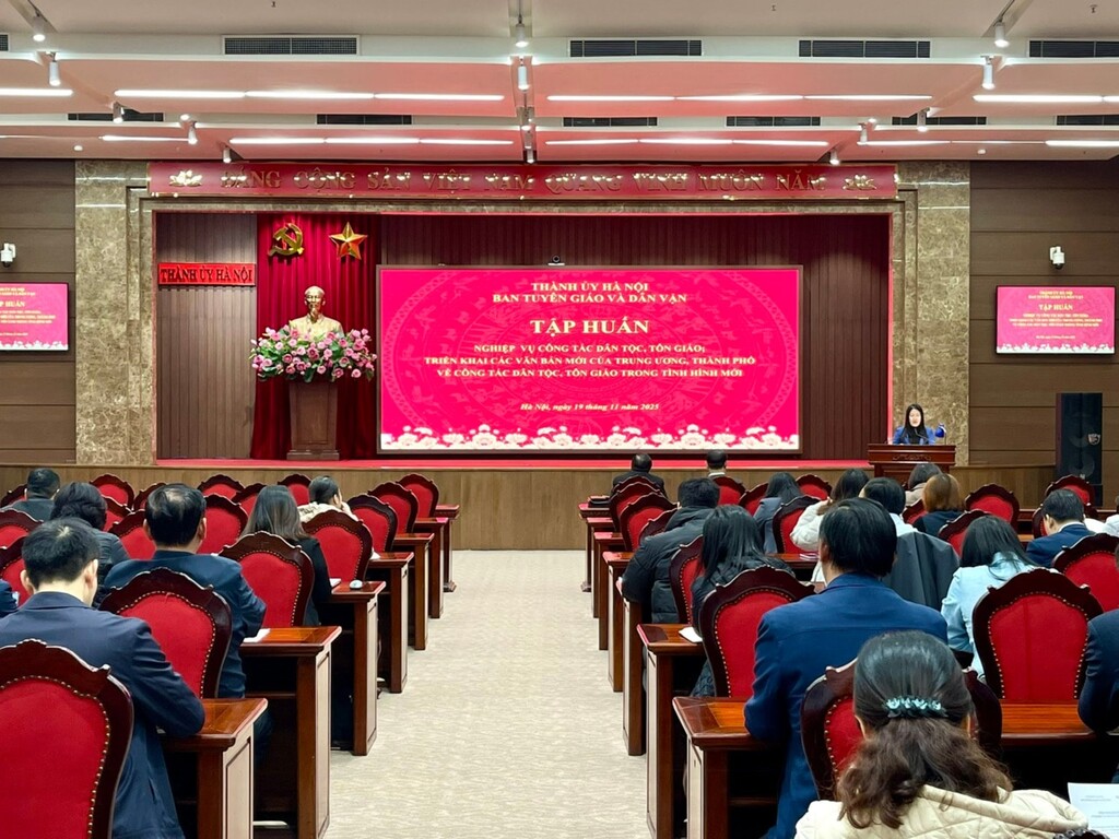 Ngày 19/11, Ban Tuyên giáo và Dân vận Thành ủy Hà Nội tổ chức Hội nghị tập huấn nghiệp vụ về công tác dân tộc, tôn giáo; triển khai các văn bản mới của Trung ương, Thành phố về công tác dân tộc, tôn giáo trong tình hình mới, nhằm bổ sung kiến thức, kỹ năng và kinh nghiệm cho đội ngũ cán bộ xã, phường trên địa bàn.
