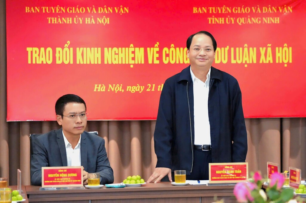 Đồng chí Nguyễn Doãn Toản, Trưởng Ban Tuyên giáo và Dân vận Thành uỷ Hà Nội và đồng chí Nguyễn Hồng Dương, Trưởng Ban Tuyên giáo và Dân vận Tỉnh uỷ Quảng Ninh đề nghị trong thời gian tới, hai đơn vị tiếp tục duy trì cơ chế phối hợp, trao đổi thường xuyên. Đồng thời, tăng cường phối hợp trong nắm bắt, dự báo tình hình dư luận xã hội; kịp thời tham mưu cấp ủy chỉ đạo giải quyết các vấn đề nhân dân quan tâm; tiếp tục đẩy mạnh công tác tuyên truyền, phát huy vai trò của đội ngũ cộng tác viên dư luận xã hội; nghiên cứu mở rộng ứng dụng công nghệ, nền tảng số trong quản lý và xử lý thông tin, nhằm nâng cao chất lượng, hiệu quả công tác dư luận xã hội trên địa bàn hai tỉnh, thành phố./.