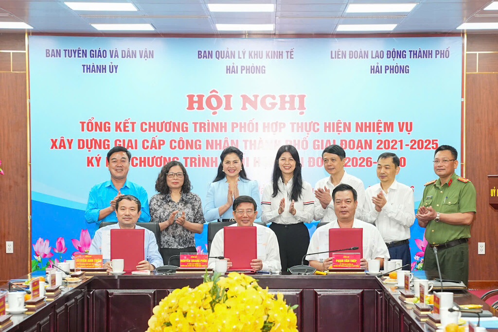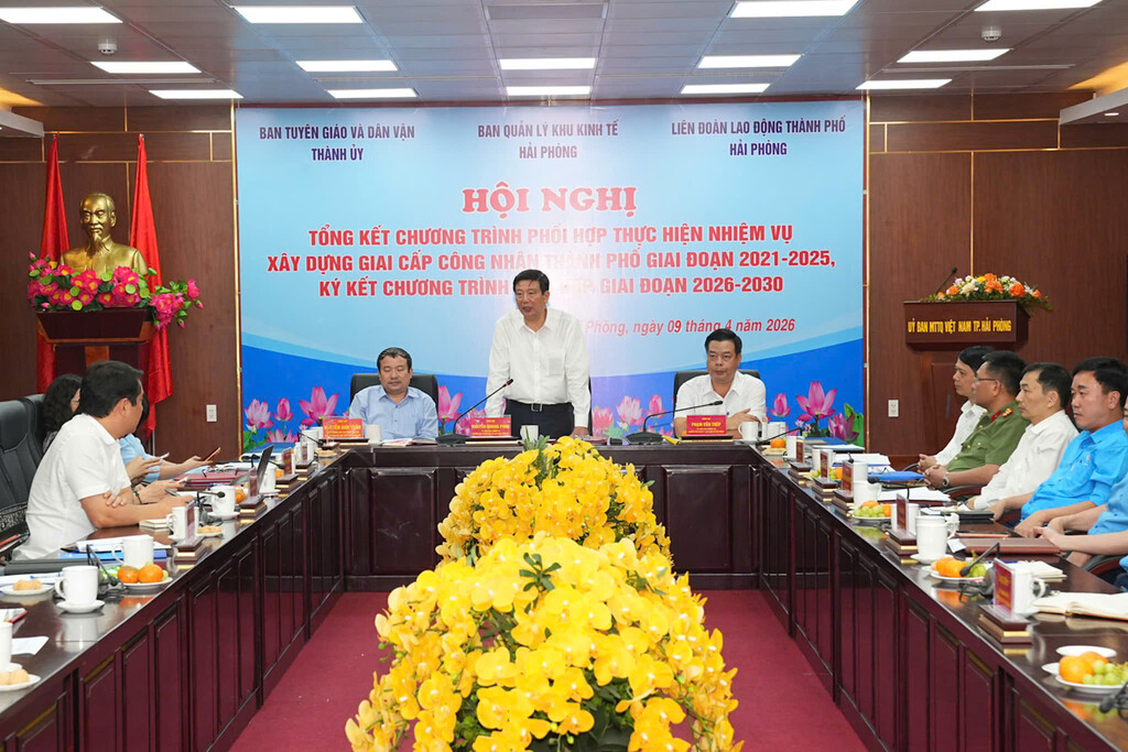 Ngày 9/4, Ban Tuyên giáo và Dân vận Thành ủy, Ban Quản lý Khu Kinh tế Hải Phòng và Liên đoàn Lao động thành phố Hải Phòng phối hợp tổ chức Hội nghị tổng kết Chương trình thực hiện nhiệm vụ xây dựng giai cấp công nhân trong khu công nghiệp, khu kinh tế giai đoạn 2021 - 2025 và ký kết Chương trình phối hợp giai đoạn 2026 - 2030.