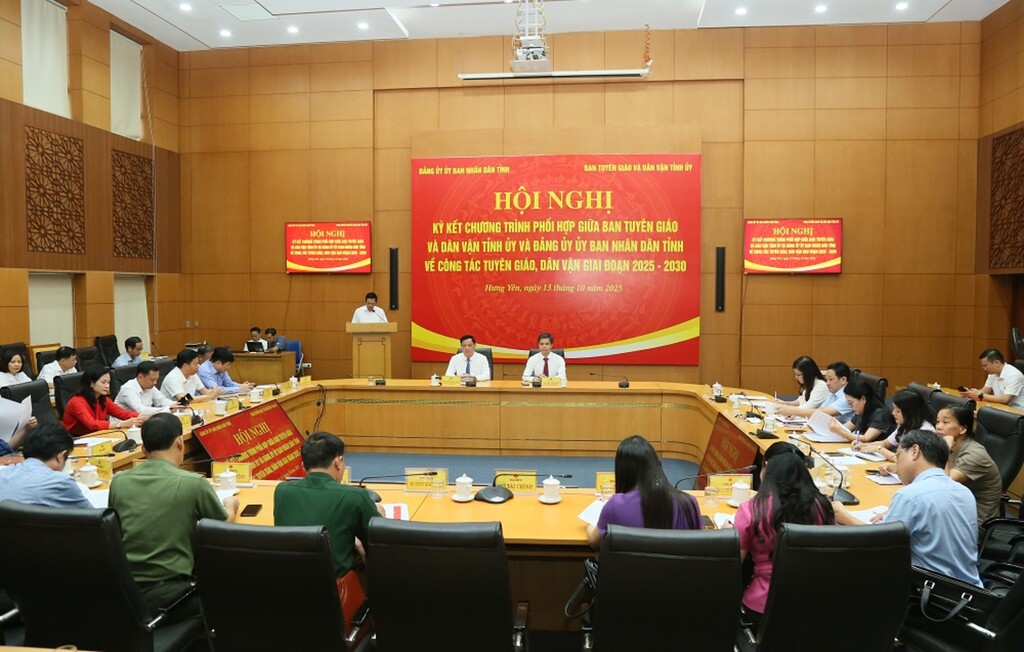 Ngày 13/10, Đảng ủy UBND tỉnh Hưng Yên, Ban Tuyên giáo và Dân vận Tỉnh ủy tổ chức Hội nghị ký kết Chương trình phối hợp về công tác tuyên giáo, dân vận giai đoạn 2025 - 2030.