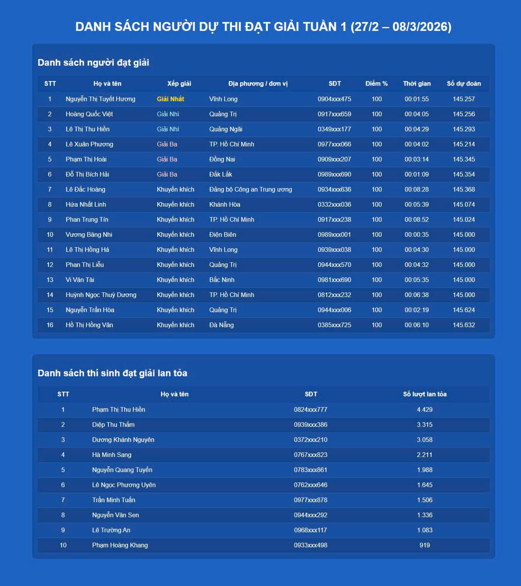 Căn cứ vào Thể lệ Cuộc thi, đối chiếu các tiêu chí xét giải thưởng Tuần (trả lời đúng tất cả 10 câu hỏi trắc nghiệm tại mỗi lượt dự thi; dự đoán đúng hoặc gần đúng nhất số lượt người dự thi trả lời đúng 10 câu hỏi trắc nghiệm (tại tuần thi đó); có thời gian hoàn thành bài thi ít nhất tại lượt thi được xét) và giải thưởng lan tỏa Cuộc thi (người có số lượt giới thiệu nhiều nhất, người đã hoàn thành bài thi trong tuần thi, người có thời gian hoàn thành bài thi sớm nhất), Ban Tổ chức Cuộc thi công bố danh sách cá nhân đạt giải Tuần thứ nhất (01 giải Nhất, 02 giải Nhì, 03 giải Ba, 10 giải Khuyến khích và 10 giải Lan tỏa) như sau: