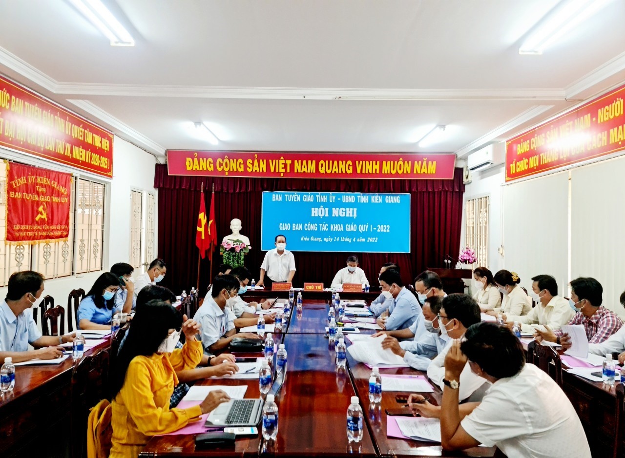 Sáng 14/4/2022, Ban Tuyên giáo Tỉnh ủy Kiên Giang và Ủy ban nhân dân tỉnh Kiên Giang chủ trì tổ chức Hội nghị giao ban công tác Khoa giáo quý I, triển khai nhiệm vụ trọng tâm quý II/2022. Đồng chí Nguyễn Thanh Phong, Ủy viên Ban Thường vụ, Trưởng ban Tuyên giáo Tỉnh ủy và đồng chí Nguyễn Lưu Trung, Tỉnh ủy viên, Phó Chủ tịch Ủy ban nhân dân tỉnh, chủ trì Hội nghị.
