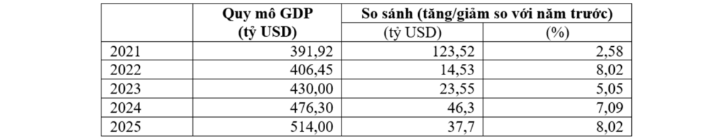 Kết quả ở Bảng 1 cho thấy, trong giai đoạn 2021 - 2025, quy mô GDP của Việt Nam luôn tăng theo hướng năm sau cao hơn năm trước. Cụ thể: trong khi năm 2021, nhiều nền kinh tế trên thế giới tăng trưởng âm do đại dịch Covid-19 nhưng Việt Nam vẫn tăng 2,58%, với quy mô 391,92 tỷ USD[7]. Năm 2022, mức tăng trưởng là 8,02%, với quy mô 406,45 tỷ USD[8]; năm 2023, mức tăng trưởng 5,05% với quy mô đạt 430 tỷ USD[9]. Năm 2024 tăng 7,09% với quy mô GDP 476,3 tỷ USD[10], quy mô nền kinh tế xếp thứ 34 thế giới. Năm 2025 tăng trưởng trên 8,02% với quy mô GDP 514 tỷ USD[11], đưa Việt Nam vào nhóm 32 nền kinh tế tăng trưởng cao của thế giới.