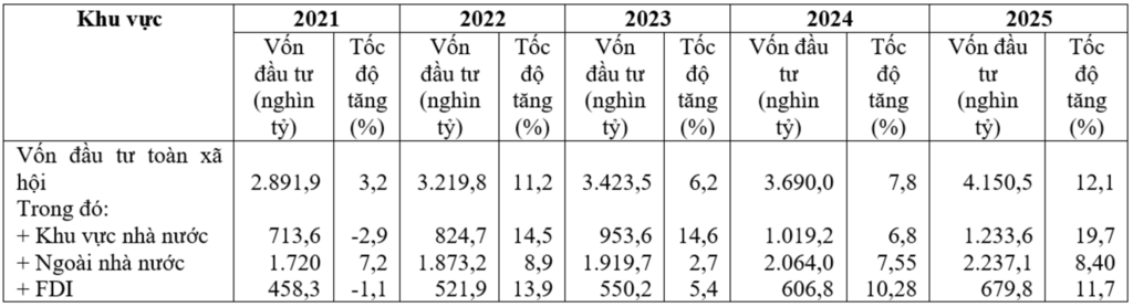 Đáng chú ý là mức đầu tư của khu vực ngoài nhà nước hàng năm đều chiếm tỷ trọng cao hơn so với các khu vực khác, tương ứng qua các năm là: 59,47%; 58,17%; 56,07%; 55,93% và 53,9%; khu vực nhà nước qua các năm có tăng nhẹ: 24,67%; 25,61%; 27,85; 27,61% và 28,98%, 29,7%; khu vực FDI là: 15,86%; 16,73%; 16,07%; 16,42% và 16,4%. Điều này thể hiện chủ trương đúng đắn về phát triển kinh tế tư nhân đã được Đảng ta xác định; đồng thời thể hiện uy tín của Việt Nam ngày càng tăng lên trên trường quốc tế, qua đó, thu hút FDI ngày càng có triển vọng tốt, chất lượng ngày càng cao. Đặc biệt năm 2024, 2025, Chính phủ đã chỉ đạo kiên quyết và đôn đốc thực hiện giải ngân vốn đầu tư công các dự án trọng điểm quốc gia nhằm phát huy vai trò kích hoạt, tạo không gian phát triển mới, dẫn dắt các nguồn lực xã hội đầu tư cho phát triển. Theo Báo cáo của Bộ Tài chính, tính đến ngày 31/12/2025, cả nước giải ngân vốn đầu tư công được đạt khoảng 755.000 tỷ đồng, chiếm 83,7% kế hoạch Thủ tướng Chính phủ giao, cao hơn năm trước.