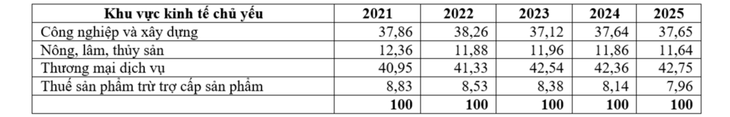 Kết quả ở Bảng 4 cho thấy, tỷ trọng khu vực thương mại dịch vụ hàng năm đều đạt mức cao và có xu hướng tăng, từ 40,95% năm 2021, tăng lên 42,92% năm 2025. Công nghiệp và xây dựng là khu vực chiếm tỷ trọng cao thứ hai và có xu hướng ổn định. Thứ ba là khu vực nông, lâm thủy sản có xu hướng giảm nhẹ. Trong khi đó, khu vực thuế sản phẩm trừ trợ cấp sản phẩm có xu hướng giảm nhẹ hàng năm. Nhìn chung, cơ cấu kinh tế đã có sự chuyển biến tích cực theo hướng công nghiệp hóa, hiện đại hóa. Trong mỗi khu vực kinh tế chủ yếu cũng có sự chuyển dịch cơ cấu một cách hợp lý, theo hướng gia tăng sản phẩm, dịch vụ có hàm lượng khoa học cao, chế biến sâu, sản phẩm xanh, thân thiện với môi trường; quy mô, tiềm lực cạnh tranh của nền kinh tế được nâng lên, tạo điều kiện thuận lợi cho cho những đổi mới và đột phá trong tăng trưởng trong giai đoạn 2026 - 2030.