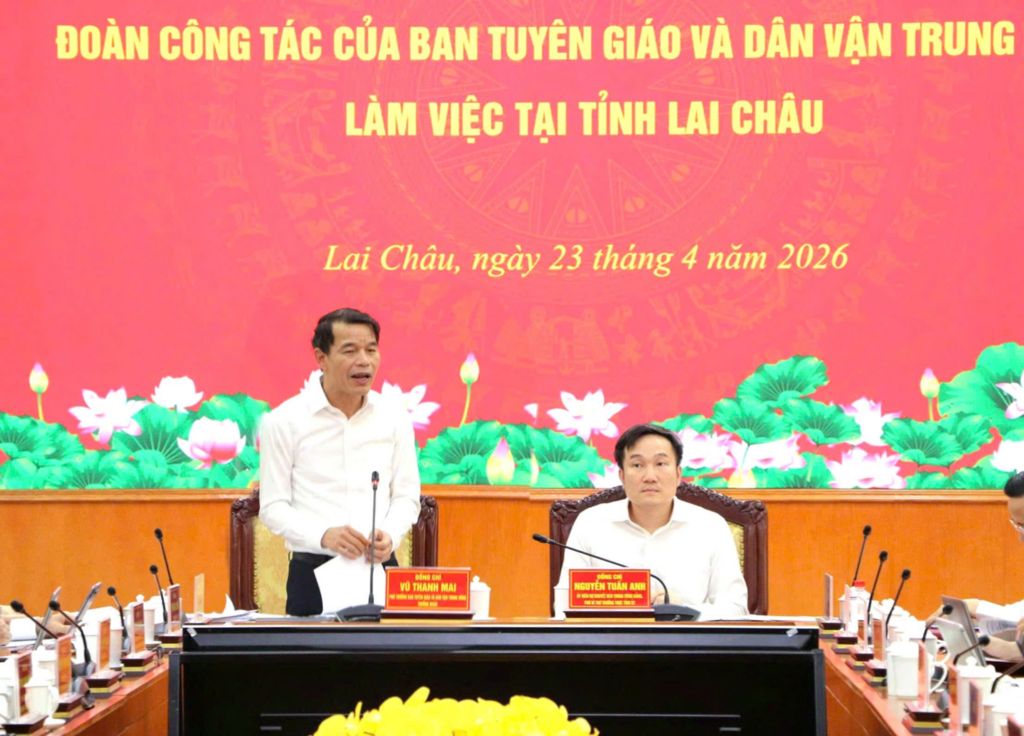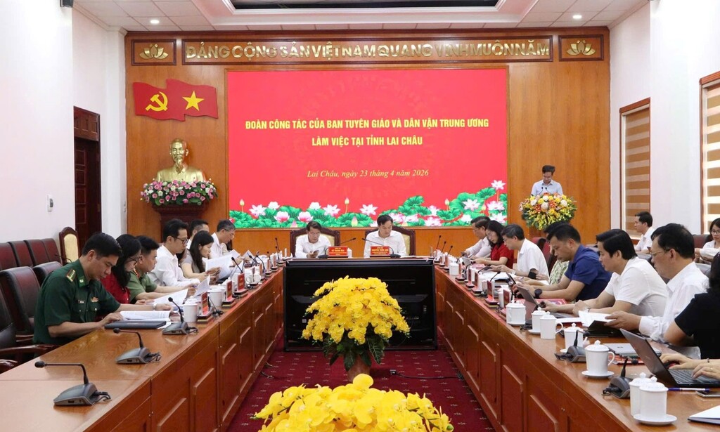 Ngày 23/4, Đoàn công tác của Ban Tuyên giáo và Dân vận Trung ương đã có buổi làm việc với tỉnh Lai Châu về tình hình triển khai thực hiện các chỉ thị, nghị quyết của Bộ Chính trị về: công tác phổ cập giáo dục, giáo dục bắt buộc, xóa mù chữ cho người lớn và đẩy mạnh phân luồng học sinh trong giáo dục phổ thông; đột phá phát triển giáo dục và đào tạo; đột phá phát triển khoa học, công nghệ, đổi mới sáng tạo và chuyển đổi số quốc gia.
