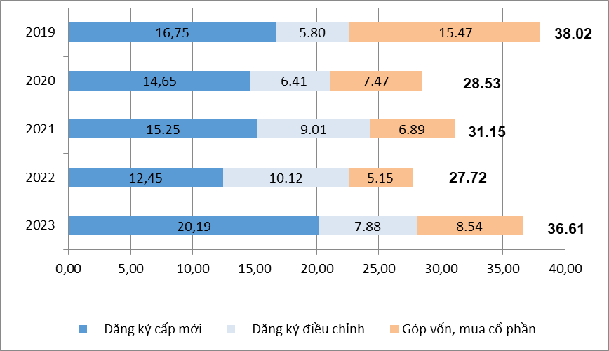 Tính đến ngày 20/12/2023, cả nước có 3.188 dự án mới được cấp giấy chứng nhận đăng ký đầu tư nước ngoài với số vốn đạt 20,19 tỷ USD, tăng 56,6% về số dự án và tăng 62,2% về số vốn so với năm 2022 (năm 2022 có 2.036 dự án, tăng 17,1% và vốn đăng ký đạt 12,44 tỷ USD, giảm 18,4%). Vốn đầu tư nước ngoài thực hiện đạt 23,18 tỷ USD, tăng 3,5% so với năm trước, là mức thực hiện cao nhất trong 5 năm qua (3).