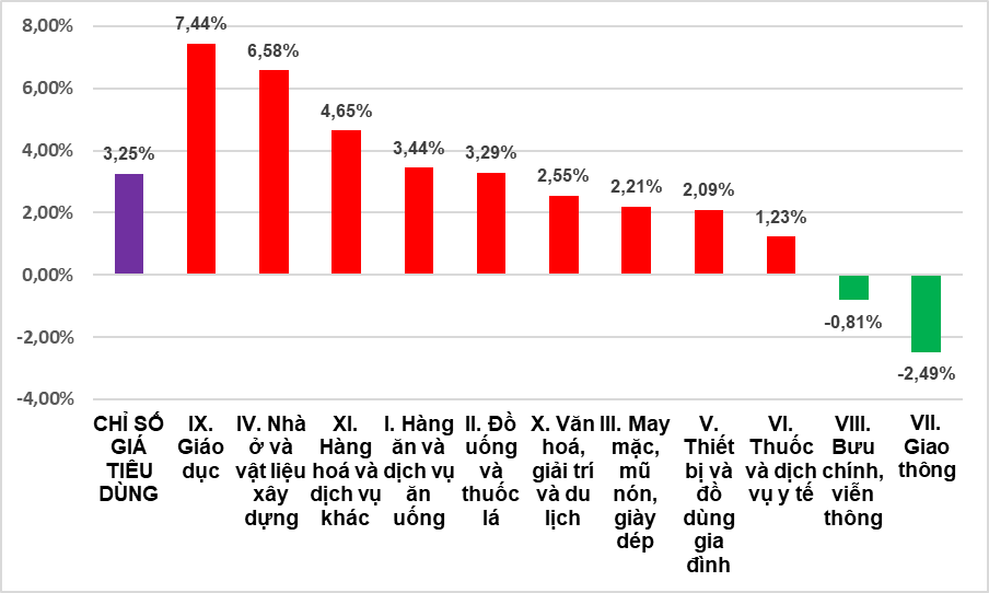 (8) Lạm phát được kiểm soát theo mục tiêu đề ra. Chỉ số giá tiêu dùng (CPI) bình quân năm 2023 tăng 3,25%, thấp hơn mục tiêu 4,5% của cả năm 2023.