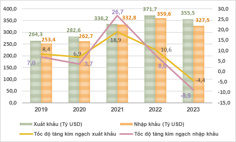 (3) Vốn FDI thực các năm 2019-2023 lần lượt là: 20,4 tỷ USD; 20 tỷ USD; 19,7 tỷ USD; 22,4 tỷ USD; 23,2 tỷ USD.