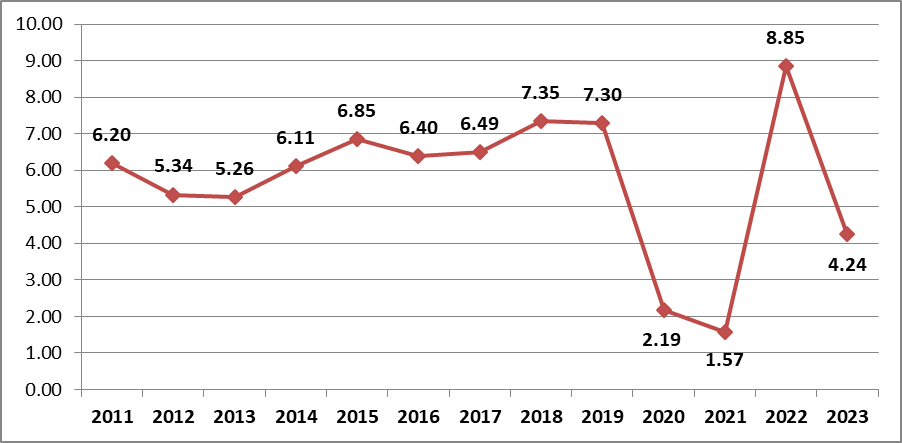 (8) Lạm phát được kiểm soát theo mục tiêu đề ra. Chỉ số giá tiêu dùng (CPI) bình quân 9 tháng tăng 3,16%, thấp hơn mục tiêu 4,5% của cả năm 2023.