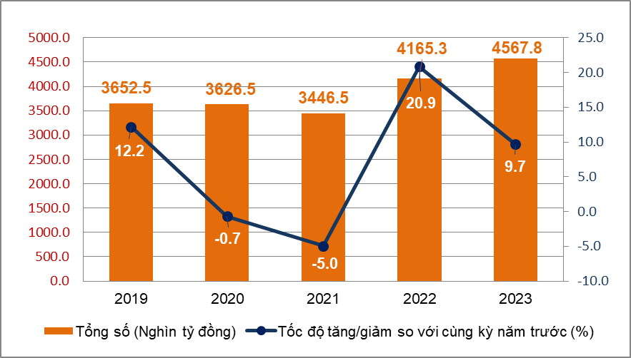 (1) Trong bối cảnh kinh tế thế giới còn nhiều bất ổn, khó khăn nhiều hơn thuận lợi nhưng tăng trưởng kinh tế 9 tháng năm 2023 của nước ta duy trì đà tăng trưởng tích cực (quý I tăng 3,28%; quý II tăng 4,05%; quý III tăng 5,33%), bình quân 9 tháng năm 2023 tăng 4,24% so với cùng kỳ năm trước. Khu vực nông, lâm nghiệp và thủy sản tăng 3,43%, đóng góp 9,16% vào tốc độ tăng tổng giá trị tăng thêm của toàn nền kinh tế. Khu vực công nghiệp và xây dựng tăng 2,41%, đóng góp 22,27%. Khu vực dịch vụ tăng 6,32%, đóng góp 68,57%, trong đó tăng trưởng của một số ngành dịch vụ thị trường đạt mức khá: Bán buôn, bán lẻ tăng 8,04%; vận tải kho bãi tăng 8,66%; dịch vụ lưu trú và ăn uống tăng 13,17%; hoạt động tài chính, ngân hàng và bảo hiểm tăng 6,91%.