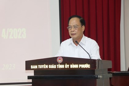 Tin hoạt độngBình Phước: Tổ chức Hội nghị trực tuyến Báo cáo viên cấp tỉnh tháng 4Sáng 18/4/2023, Ban Tuyên giáo Tỉnh ủy Bình Phước tổ chức Hội nghị báo cáo viên cấp tỉnh định kỳ tháng 4. Đồng chí Vũ Tiến Điền, Tỉnh ủy viên, Trưởng Ban Tuyên giáo Tỉnh ủy, báo cáo viên Trung ương chủ trì Hội nghị.