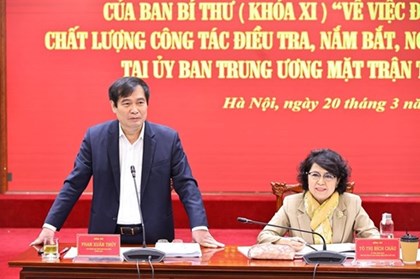 Ngày 20/3, Đoàn khảo sát của Ban Tuyên giáo Trung ương do đồng chí Phan Xuân Thủy, Phó Trưởng ban làm trưởng đoàn, đã làm việc, khảo sát việc triển khai, thực hiện Kết luận số 100-KL/TW, ngày 18/8/2014 của Ban Bí thư (khoá XI) về việc “Đổi mới và nâng cao chất lượng công tác điều tra, nắm bắt, nghiên cứu dư luận xã hội” tại Ủy ban Trung ương Mặt trận Tổ quốc Việt Nam. Đồng chí Tô Thị Bích Châu, Phó Chủ tịch Ủy ban Trung ương MTTQ Việt Nam chủ trì tiếp và làm việc với Đoàn. -