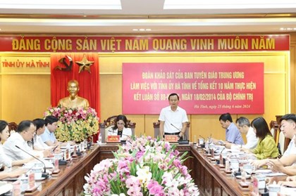 25/06/2024 17:14' Đoàn khảo sát của Ban Tuyên giáo Trung ương đánh giá: Hà Tĩnh đã triển khai Kết luận 88-KL/TW, ngày 18/2/2024 của Bộ Chính trị một cách bài bản và đạt nhiều kết quả nổi bật.