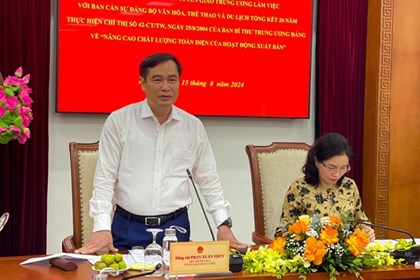 15/08/2024 18:35' Ngày 15/8, Đoàn khảo sát của Ban Tuyên giáo Trung ương đã có buổi làm việc với Ban Cán sự đảng Bộ Văn hóa, Thể thao và Du lịch về tổng kết 20 năm thực hiện Chỉ thị số 42-CT/TW, ngày 25/08/2004 của Ban Bí thư về "Nâng cao chất lượng toàn diện của hoạt động xuất bản". Đồng chí Phan Xuân Thủy, Phó Trưởng ban Tuyên giáo Trung ương và đồng chí Trịnh Thị Thủy, Thứ trưởng Bộ Văn hóa, Thể thao và Du lịch đồng chủ trì buổi làm việc.