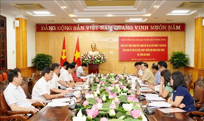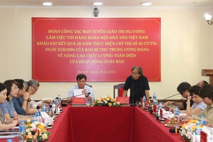 26/08/2024 18:15' Ngày 26/8, Đoàn công tác Ban Tuyên giáo Trung ương do đồng chí Phan Xuân Thủy, Phó Trưởng ban Tuyên giáo Trung ương làm trưởng đoàn đã làm việc với Đảng đoàn Hội Nhà văn Việt Nam về khảo sát kết quả 20 năm thực hiện Chỉ thị số 42-CT/TW, ngày 25/8/2004 của Ban Bí thư Trung ương Đảng về nâng cao chất lượng toàn diện của hoạt động xuất bản.