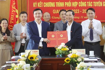 Ngày 14/11, tại tỉnh Bắc Giang, Ban Tuyên giáo Tỉnh uỷ Bắc Giang và Ban Tuyên giáo Tỉnh uỷ Thái Nguyên tổ chức Hội nghị ký kết chương trình phối hợp công tác tuyên giáo giai đoạn 2023 - 2025. -