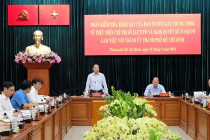 27/09/2023 18:58' Đồng chí Lê Hải Bình, Ủy viên dự khuyết Trung ương Đảng, Phó Trưởng ban Tuyên giáo Trung ương ghi nhận, Thành ủy Thành phố Hồ Chí Minh đã tập trung triển khai thực hiện hiệu quả Chỉ thị số 23-CT/TW của Ban Bí thư về tiếp tục đổi mới, nâng cao chất lượng, hiệu quả học tập, nghiên cứu, vận dụng và phát triển chủ nghĩa Mác – Lênin, tư tưởng Hồ Chí Minh trong tình hình mới…