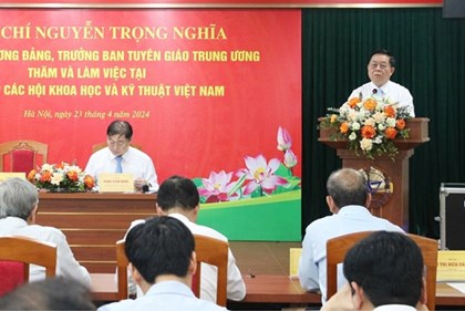 24/04/2024 08:05' Đồng chí Nguyễn Trọng Nghĩa, Bí thư Trung ương Đảng, Trưởng Ban Tuyên giáo Trung ương đề nghị Liên hiệp các hội khoa học và kỹ thuật Việt Nam, các hội thành viên lựa chọn những vấn đề lớn, tiêu biểu, bám sát chủ trương, chính sách của Đảng và Nhà nước để có những ý kiến tư vấn, phản biện sâu sắc, hiệu quả thiết thực như: Chiến lược quốc gia về phát triển đội ngũ trí thức; đường sắt tốc độ cao; công nghệ hạt nhân; công nghiệp bán dẫn...