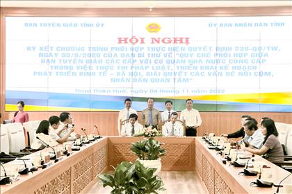 05/11/2022 08:05' Chiều 4/11, UBND tỉnh Thừa Thiên Huế và Ban Tuyên giáo Tỉnh ủy ký kết Chương trình phối hợp thực hiện Quyết định 238 – QĐ/TW, ngày 30/9/2020 của Ban Bí thư về việc ban hành “Quy chế phối hợp giữa Ban Tuyên giáo các cấp với cơ quan Nhà nước cùng cấp trong việc thực thi pháp luật, triển khai kế hoạch phát triển kinh tế - xã hội, giải quyết các vấn đề nổi cộm, Nhân dân quan tâm”(gọi tắt là Quy chế 238).