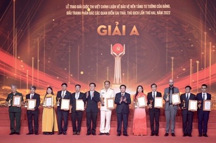 24/10/2022 08:05' Tối 23/10, tại Hà Nội, Ban Tổ chức 'Cuộc thi viết chính luận về bảo vệ nền tảng tư tưởng của Đảng, đấu tranh phản bác các quan điểm sai trái, thù địch lần thứ 2, năm 2022' trang trọng tổ chức Lễ trao giải nhằm biểu dương, tôn vinh các tác giả; nhóm tác giả có tác phẩm xuất sắc, các tập thể đạt thành tích cao.