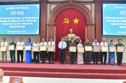 Ngày 9/5, Ban Thường vụ Tỉnh ủy Tiền Giang sơ kết 2 năm thực hiện Kết luận 01-KL/TW ngày 18/5/2021 của Bộ Chính trị về tiếp tục thực hiện Chỉ thị số 05-CT/TW ngày 15/5/2016 của Bộ Chính trị khóa XII "Về đẩy mạnh học tập và làm theo tư tưởng, đạo đức, phong cách Hồ Chí Minh"; tuyên dương, khen thưởng các tập thể, cá nhân tiêu biểu trong học tập và làm theo tư tưởng, đạo đức, phong cách Hồ Chí Minh. -