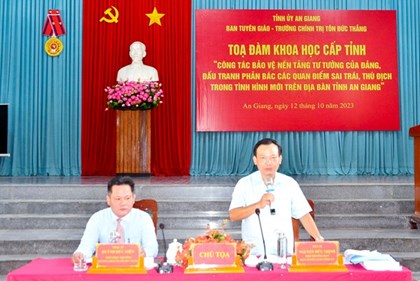 Ngày 12/10, Ban Tuyên giáo Tỉnh ủy An Giang phối hợp Trường Chính trị Tôn Đức Thắng tổ chức Tọa đàm khoa học cấp tỉnh chủ đề “Công tác bảo vệ nền tảng tư tưởng của Đảng, đấu tranh phản bác các quan điểm sai trái, thù địch trong tình hình mới trên địa bàn tỉnh An Giang”. -
