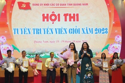 Trong hai ngày 18 và 19/10, Đảng bộ Khối Các cơ quan tỉnh Quảng Nam tổ chức vòng chung kết Hội thi tuyên truyền viên giỏi năm 2023, với sự tham dự của 16 thí sinh đạt thành tích xuất sắc sau khi trải qua các hội thi được tổ chức ở 4 Khối thi đua với sự tham gia của 65 tổ chức cơ sở đảng trực thuộc Đảng bộ Khối. -