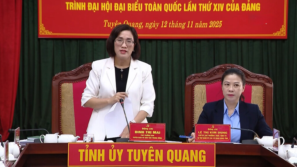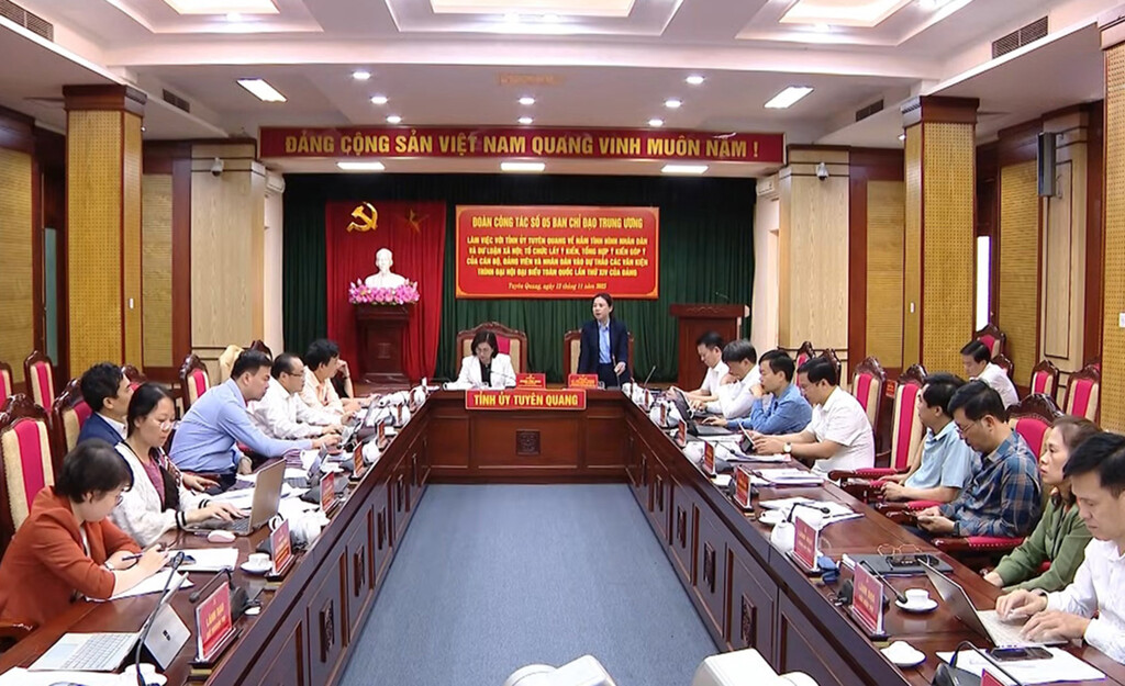 Tiếp tục chương trình công tác tại Tuyên Quang, chiều 12/11, Đoàn công tác Ban Chỉ đạo Trung ương về nắm tình hình Nhân dân và dư luận xã hội; tổ chức lấy ý kiến, tổng hợp ý kiến góp ý của cán bộ, đảng viên và Nhân dân vào Dự thảo các văn kiện trình Đại hội đại biểu toàn quốc XIV của Đảng do đồng chí Đinh Thị Mai, Phó Trưởng ban Tuyên giáo và Dân vận Trung ương làm Trưởng đoàn, làm việc với Tỉnh ủy Tuyên Quang.