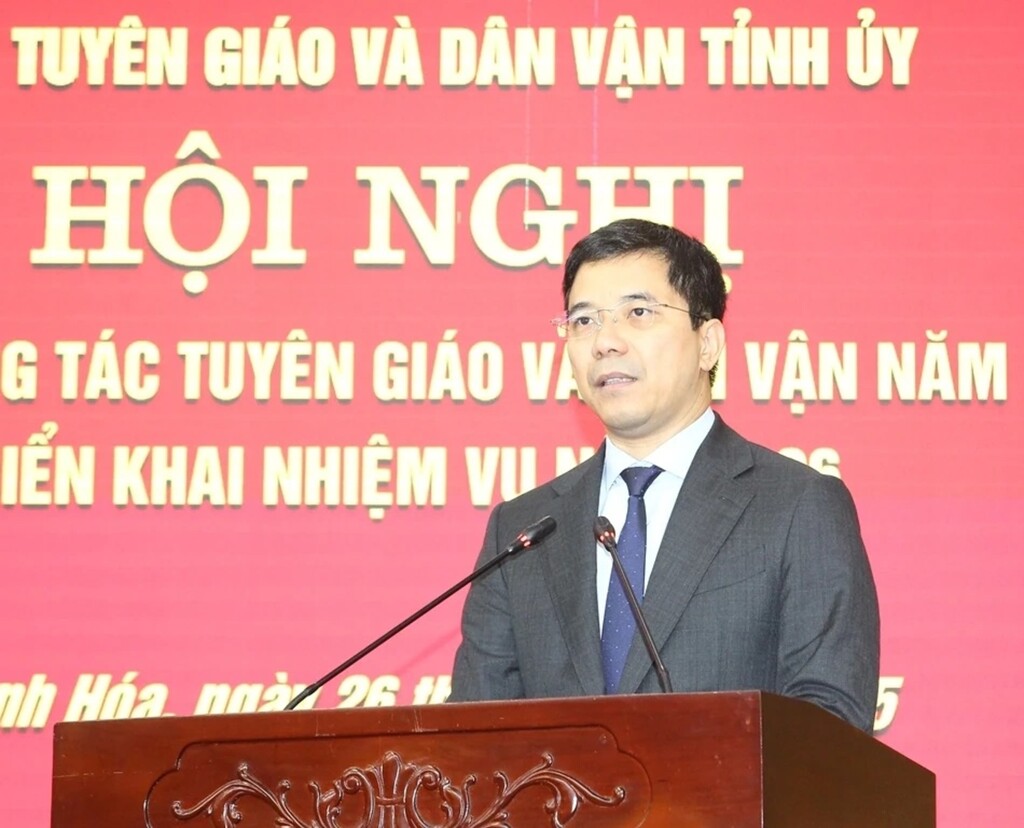 Đồng chí Phó Bí thư Thường trực Tỉnh ủy Thanh Hoá yêu cầu công tác tuyên giáo, dân vận phải “đi trước, mở đường”, tạo được sự đồng thuận xã hội, khơi dậy niềm tin và khát vọng cống hiến trong cán bộ, đảng viên và Nhân dân, biến các chủ trương của Đảng thành hành động tự giác, góp phần đẩy mạnh các phong trào thi đua yêu nước, lập thành tích chào mừng thành công Đại hội XIV của Đảng và cuộc bầu cử đại biểu Quốc hội khóa XVI, HĐND các cấp nhiệm kỳ 2026-2031.