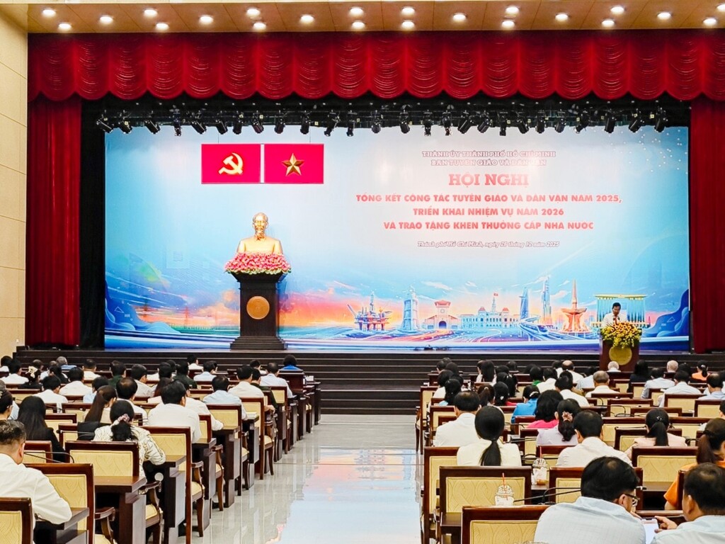 Ngày 26/12, Ban Tuyên giáo và Dân vận Thành ủy Thành phố Hồ Chí Minh tổ chức Hội nghị tổng kết công tác tuyên giáo và dân vận năm 2025, triển khai nhiệm vụ năm 2026; trao tặng khen thưởng cấp Nhà nước.