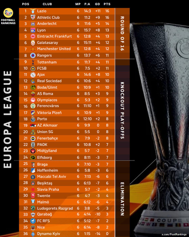 Athletic Bilbao cũng đánh bại Fenerbahce để cùng có được 16 điểm như Lazio, xếp thứ 2 do kém hơn về hiệu số bàn thắng bại.