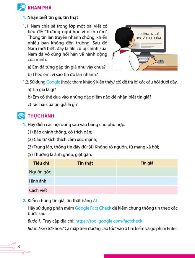 Ngoài phần trang bị kiến thức, sách còn lồng ghép truyện kể, tranh minh họa, trò chơi và tình huống thực tế. Cuối mỗi bài đều có phần “Em cần ghi nhớ” để giúp học sinh củng cố lại kiến thức trọng tâm. Một số bài học có công cụ AI hỗ trợ, các em có thể sử dụng phần mềm để quét mã QR ở đầu mỗi bài học để truy cập.