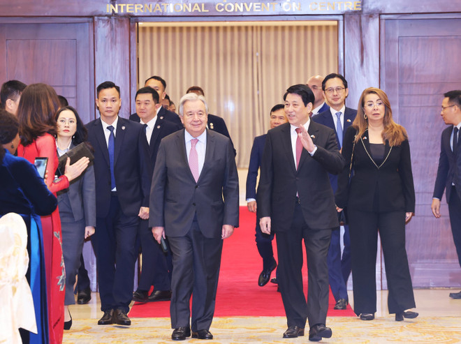 Tối 24/10, tại Trung tâm Hội nghị Quốc tế, Chủ tịch nước Lương Cường đã chủ trì chiêu đãi trọng thể Tổng Thư ký Liên hợp quốc António Guterres cùng đoàn cấp cao Liên hợp quốc đang có chuyến thăm chính thức đến Việt Nam và tham dự Lễ mở ký Công ước Liên hợp quốc về chống tội phạm mạng từ ngày 24 đến 25/10.