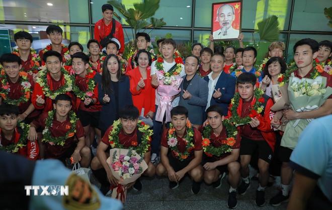 Đón đội tuyển tại sân bay có bà Lê Thị Hoàng Yến, Phó Cục trưởng Cục Thể dục Thể thao Việt Nam, ông Nguyễn Văn Phú - Tổng thư ký Liên đoàn Bóng đá Việt Nam cùng đông đảo người hâm mộ.